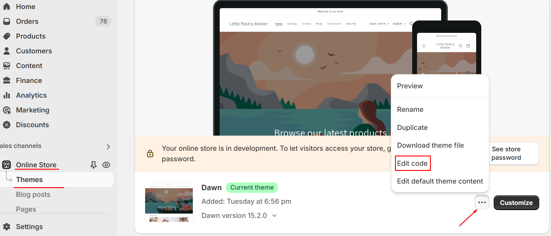 - In your Shopify Admin go to Online Store->Themes-> Click the three dots button next to Customize and select Edit code in the dropdown menu.