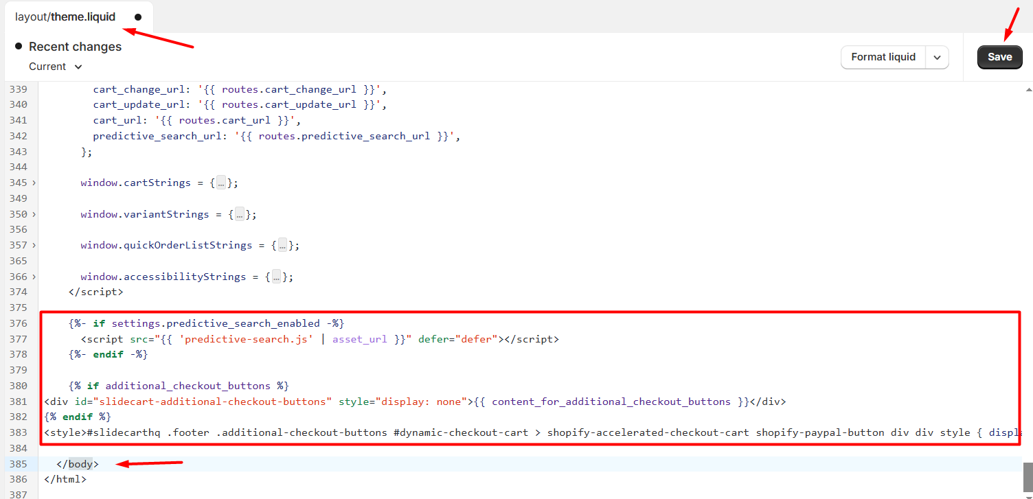 - Locate the theme.liquid file and copy the following snippet just before the closing </body> tag. Remember to hit save!