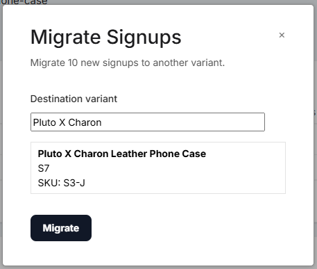 On the pop-up; input either the products name or SKU. Then press Migrate. They will have now moved over to the new Product/SKU and will send out when it is restocked!