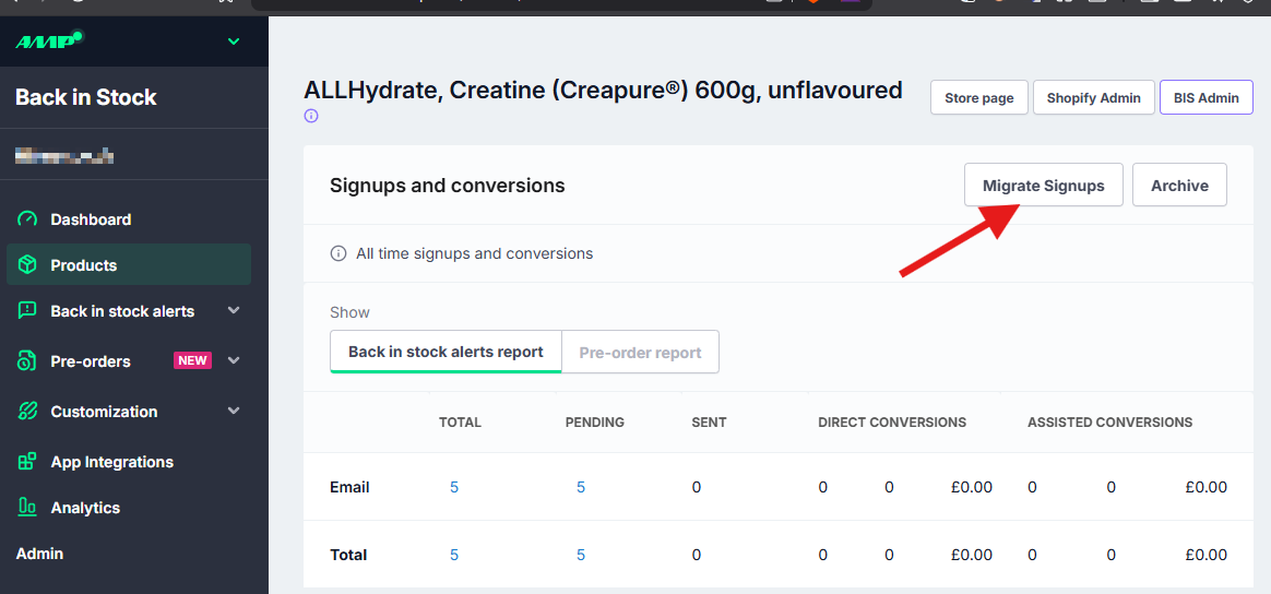 We can see there are 25 pending notifications on the product. To migrate these customer signups to a new product, press on 'Migrate Signups' in the top right.