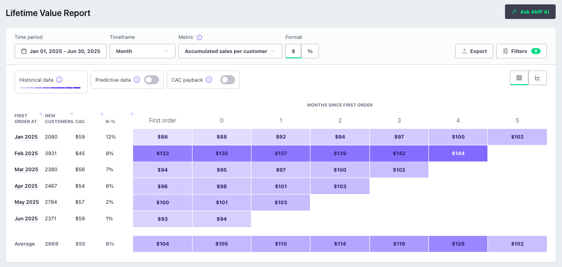 At a glance: The Lifetime Value (LTV) Report groups your customers into cohorts based on their first purchase date, allowing you to track how their value grows over time and see which groups are most profitable.
