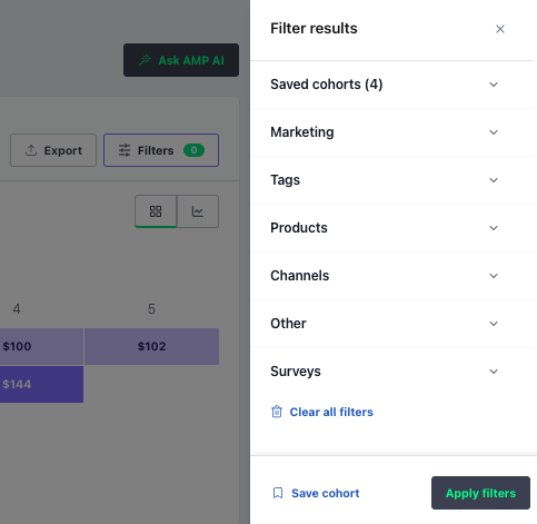 - Filters: Focus your analysis by filtering cohorts by Marketing, Tags, Products, Channels and more.