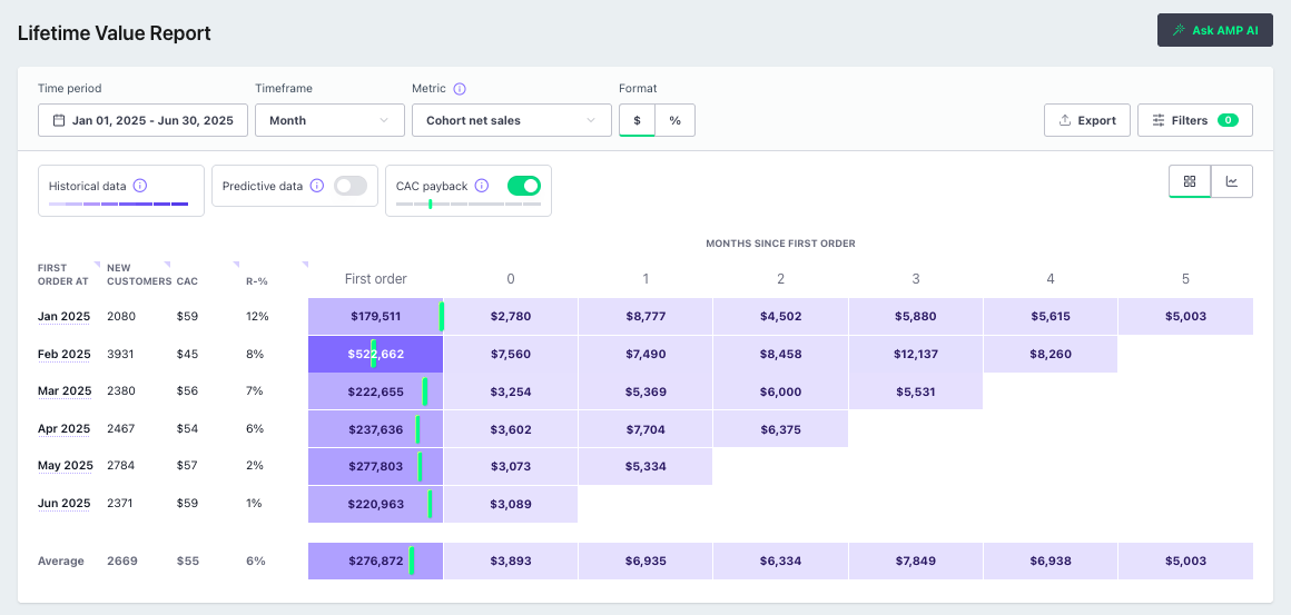 The Ask AMP AI button in the report header provides instant, data-informed answers about cohort performance.