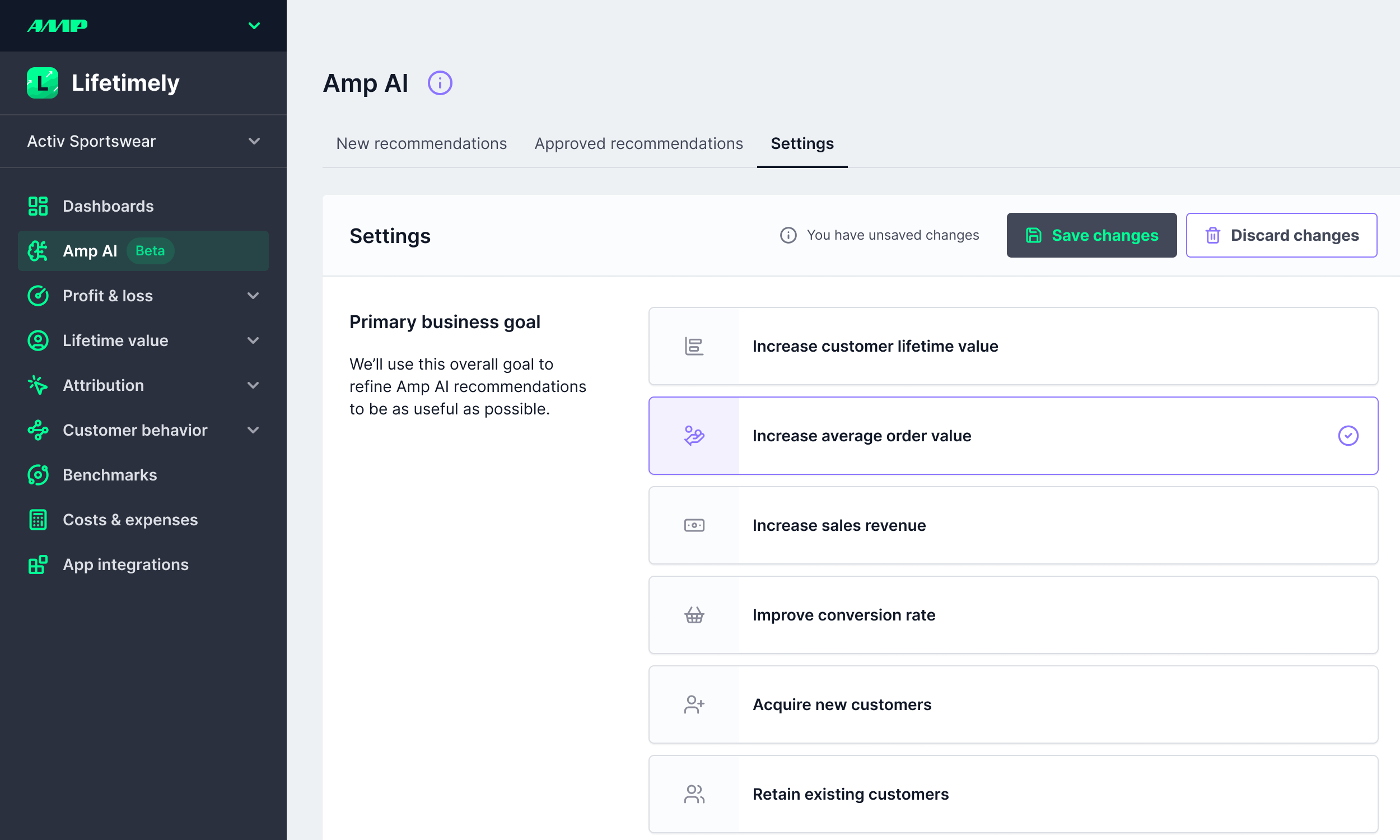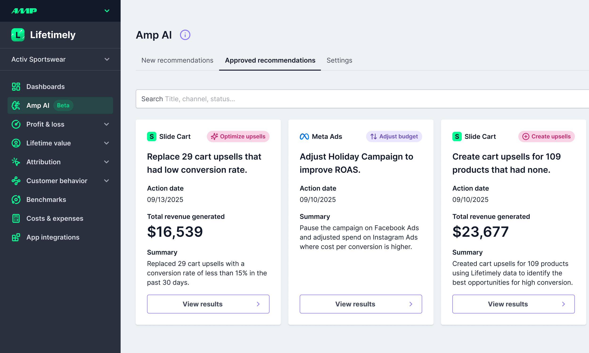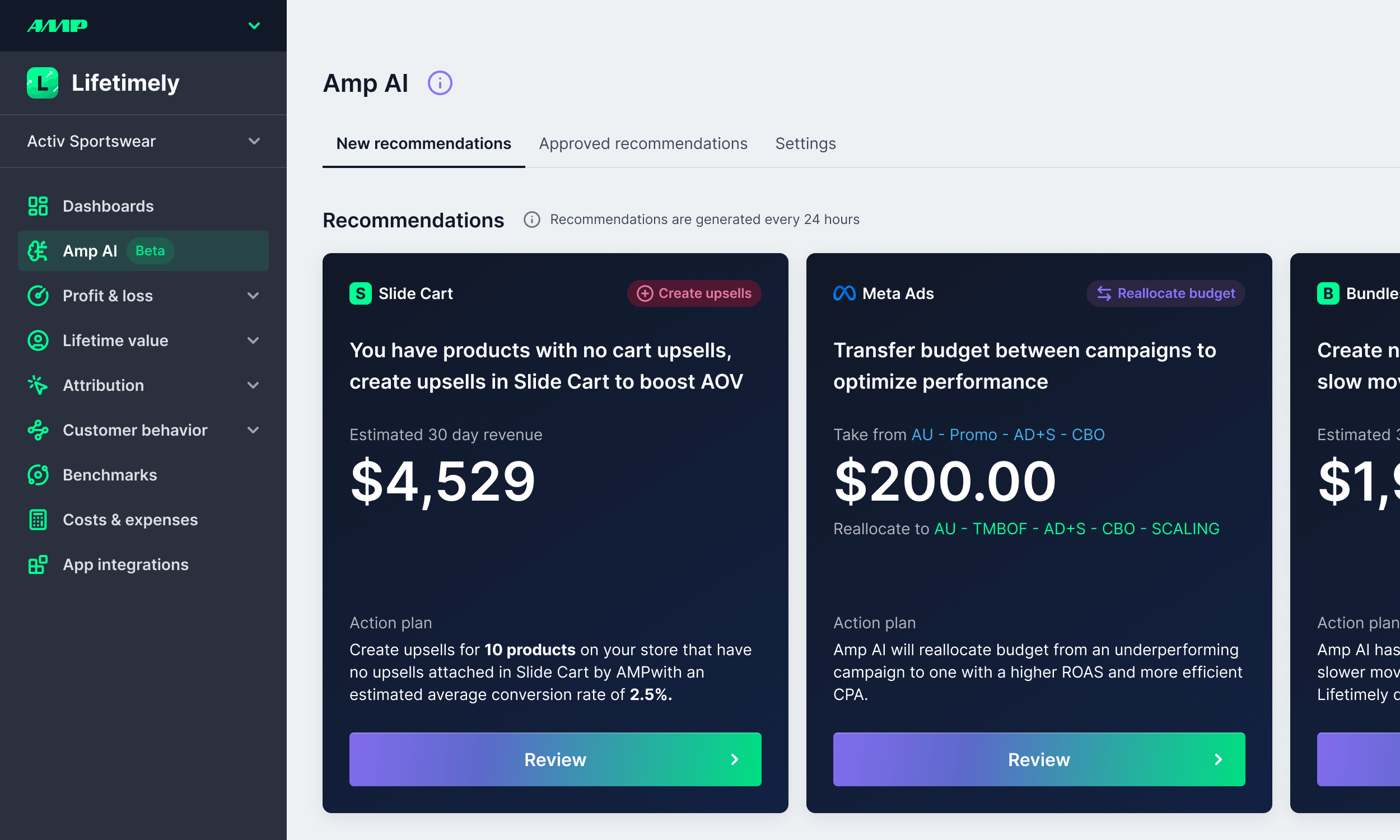 - Amp AI: An AI-powered capability from Lifetimely that analyzes your business data to recommend and automate improvements.
