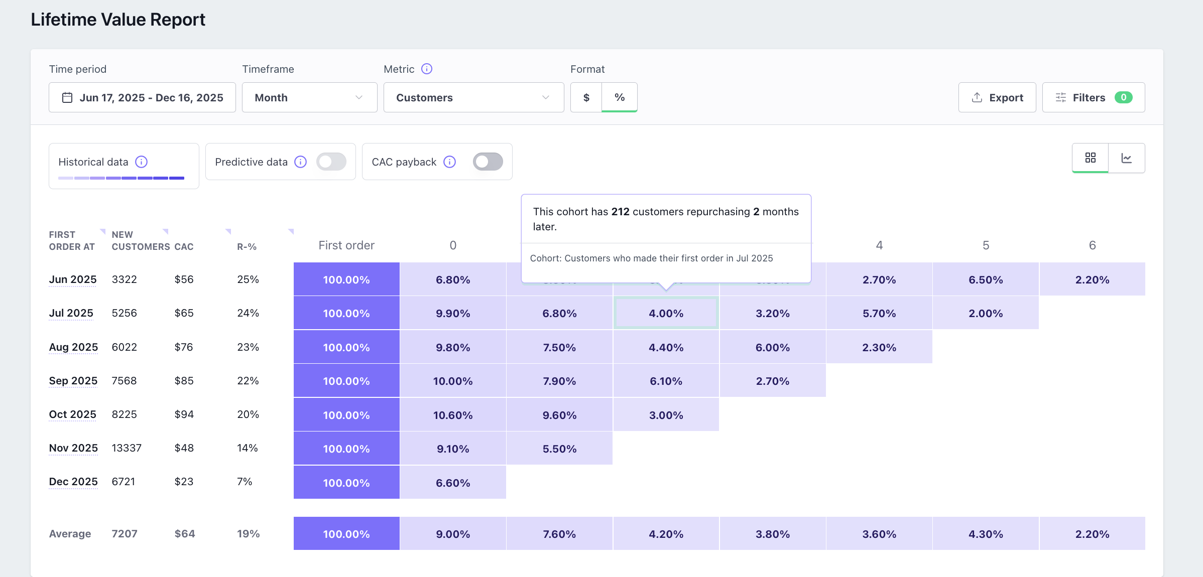 Go to Lifetime Value Report β Metric: Customers β Format: %