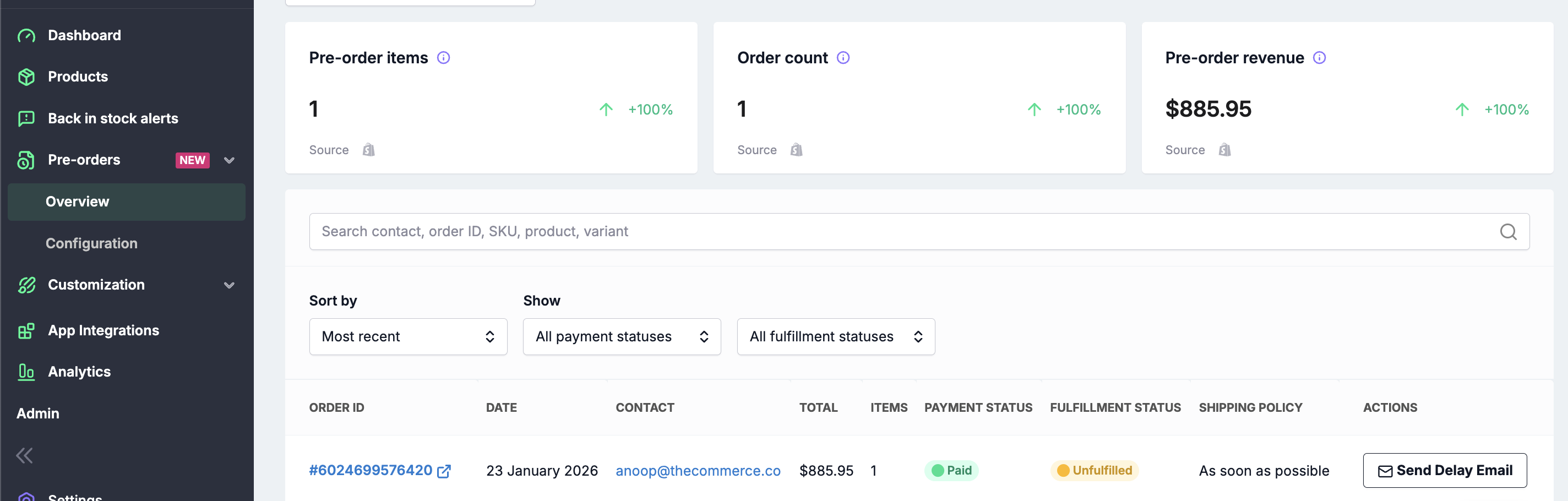 If you need to inform a customer that their pre-order is delayed, you can do so directly from your dashboard: