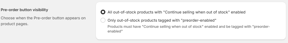 How it works: If you select this option, any product or variant that you've marked as "Continue selling when out of stock" in your Shopify product settings (as described in Step 1) will automatically display a pre-order button when its inventory hits zero.
