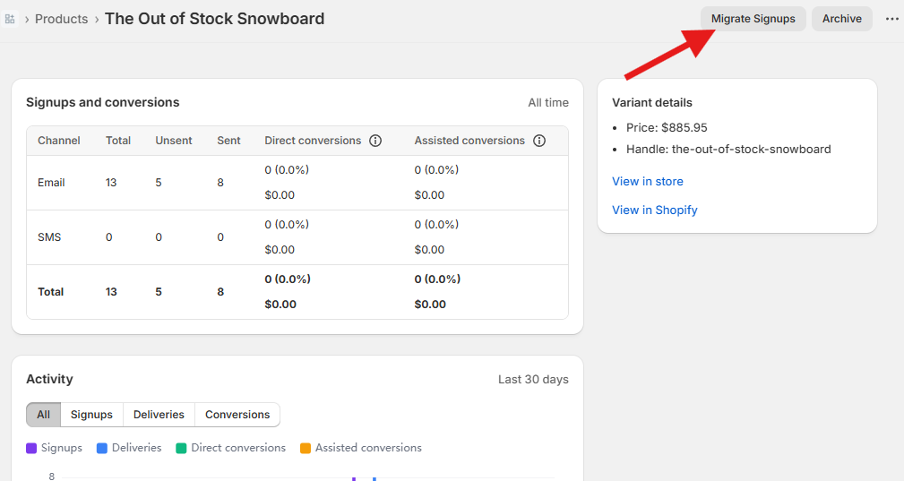 Notifications can be migrated from one product to another from the Back in Stock dashboard.