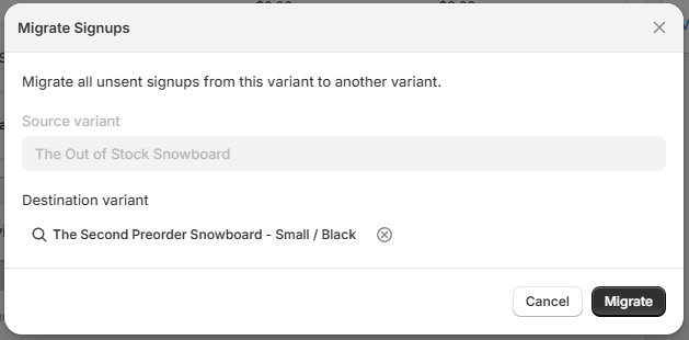 On the pop-up; input either the products name or SKU. Then press Migrate. They will have now moved over to the new Product/SKU and will send out when it is restocked!