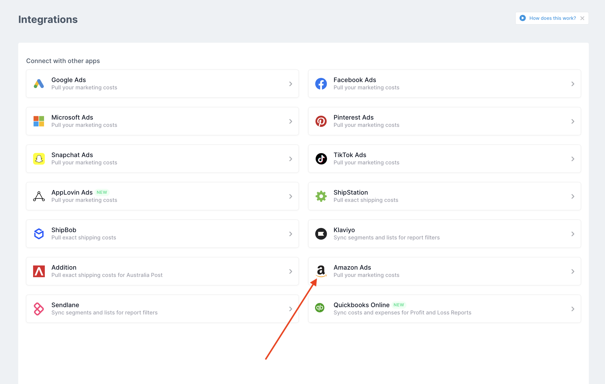 From your Amazon store in Lifetimely, go to the Integrations page and click Amazon Ads.