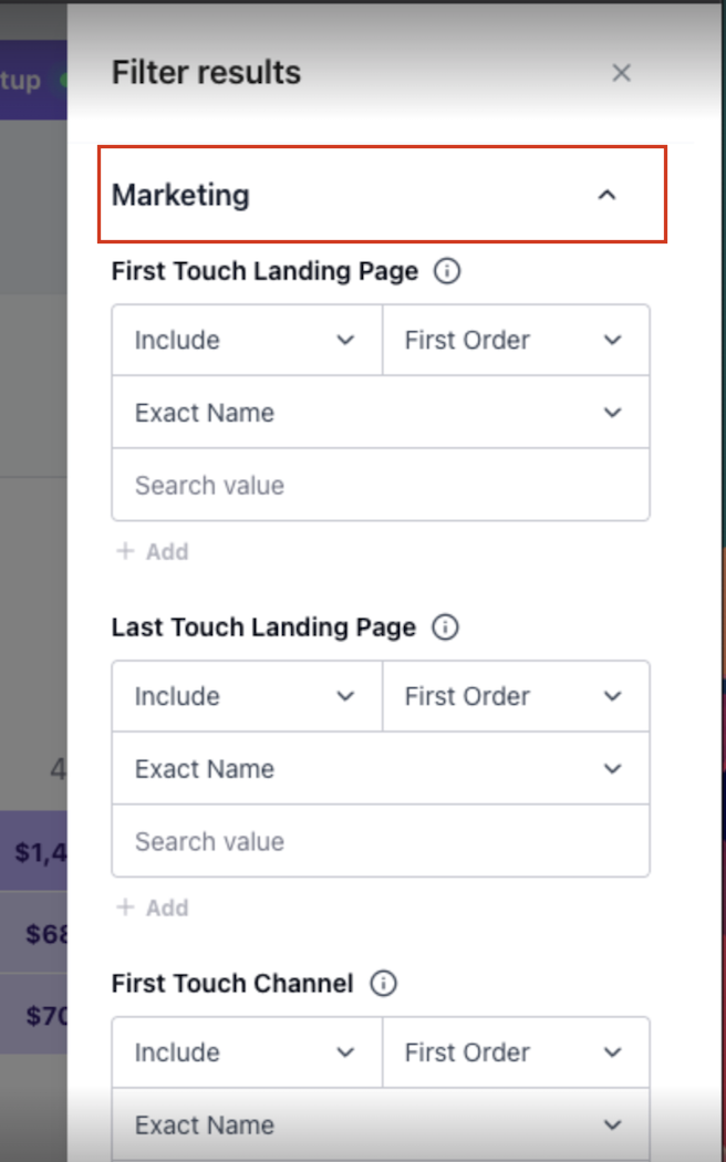 You can find them under the Marketing tab in the Filters for most reports. A common example is using the Marketing filters with the LTV report:
